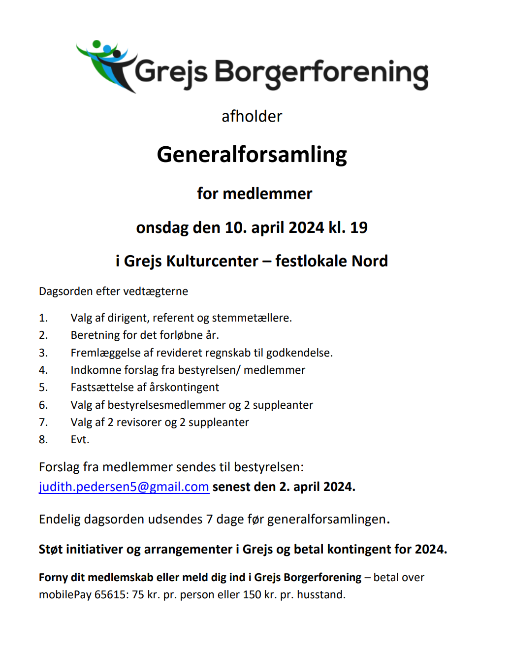 DESCRIPTION:Generalforsamlingen afholdes evt. i det nye Grejs Kulturcenter. Besked herom senere. Borgergården er vært til et lille traktement.