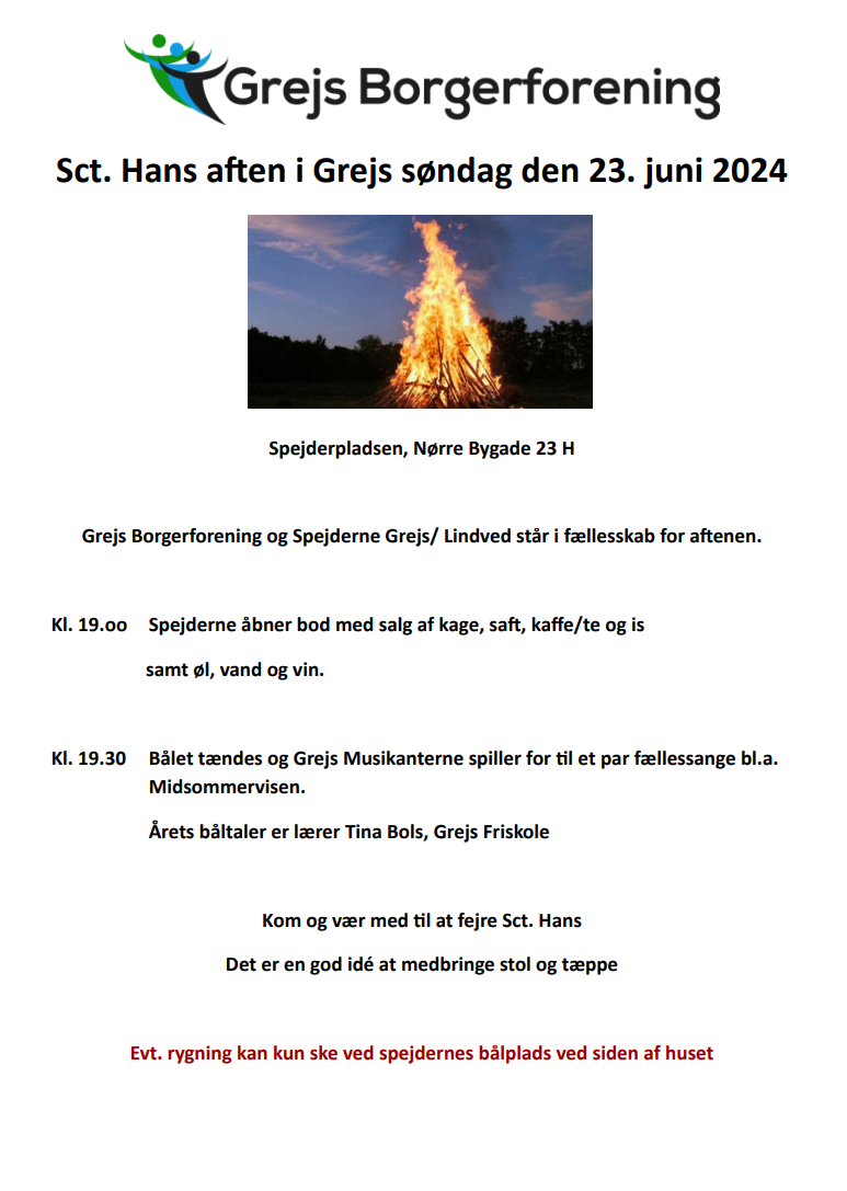 DESCRIPTION:Sct. Hans aften i Grejs søndag den 23. juni 2019 fejres i år på Spejderpladsen, Nørre Bygade 23 H – vi skåner det nye græs ved Kulturcentret og Grillhytten.\NGrejs Borgerforening og Spejderne Grejs/ Lindved står i fællesskab for aftenen.\NKl. 19.00 Åbner Spejdernes bod med salg af kage, saft, kaffe/ te og slikposer samt øl, vand og vin. Børnekonkurrence i fantasifulde hekse, præmie til de 3 flotteste. Kl. 19.30 Tændes bålet og Lars Mikkelsen spiller for til et par fælles sange, bl. a. midsommervisen.Børnene laver sammen med forældre og spejdere Bæverguf over bål\NÅrets båltaler er formand for Kulturcentret Bo Danielsen\NKom og vær med til at fejre Sct. Hans.