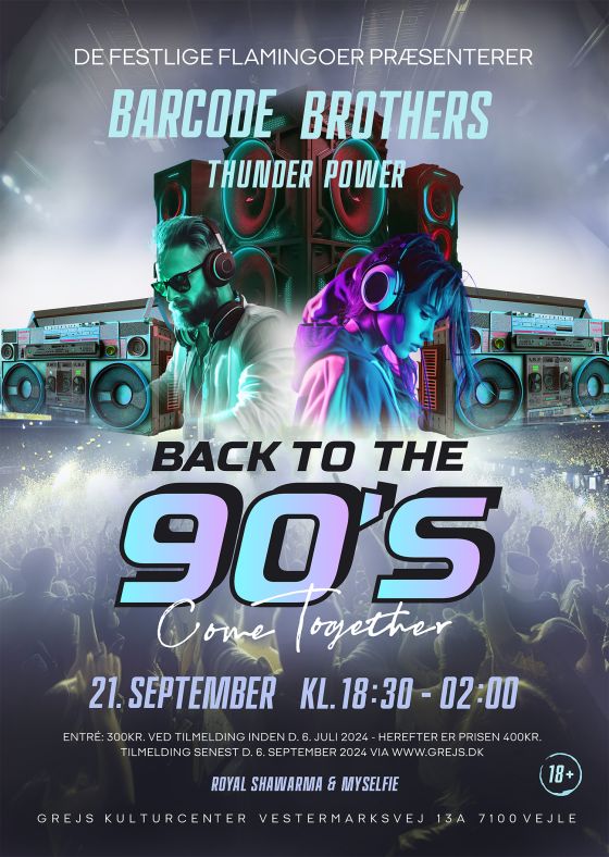 DESCRIPTION:Flamingoerne inviterer dig på en rejse tilbage til 90'erne.\NFind dine bedste 90'er-outfits frem fra skabet og forberedt dig på en aften du aldrig før har oplevet i Grejs.\N  Oplev Barcode Brothers LIVE!\NBarcode Brothers er klar til at sætte gang i festen i Grejs med deres berømte numre som "Dooh Dooh", "Flute" og mange flere. Thunderpower vil supplere med alle de hits du kender fra 90'erne.\N \NVi glæder os til at se dig til en festlig aften med masser af 90'er vibes, lækker mad, dans og nye relationer.\NMad: Royal Shawarma serverer de lækreste shawarmas (2 stk. inkl. I entré billetten)\NBilletter: sælges til kun 300 kr indtil 6. juli, herefter er prisen 400 kr.\N \N