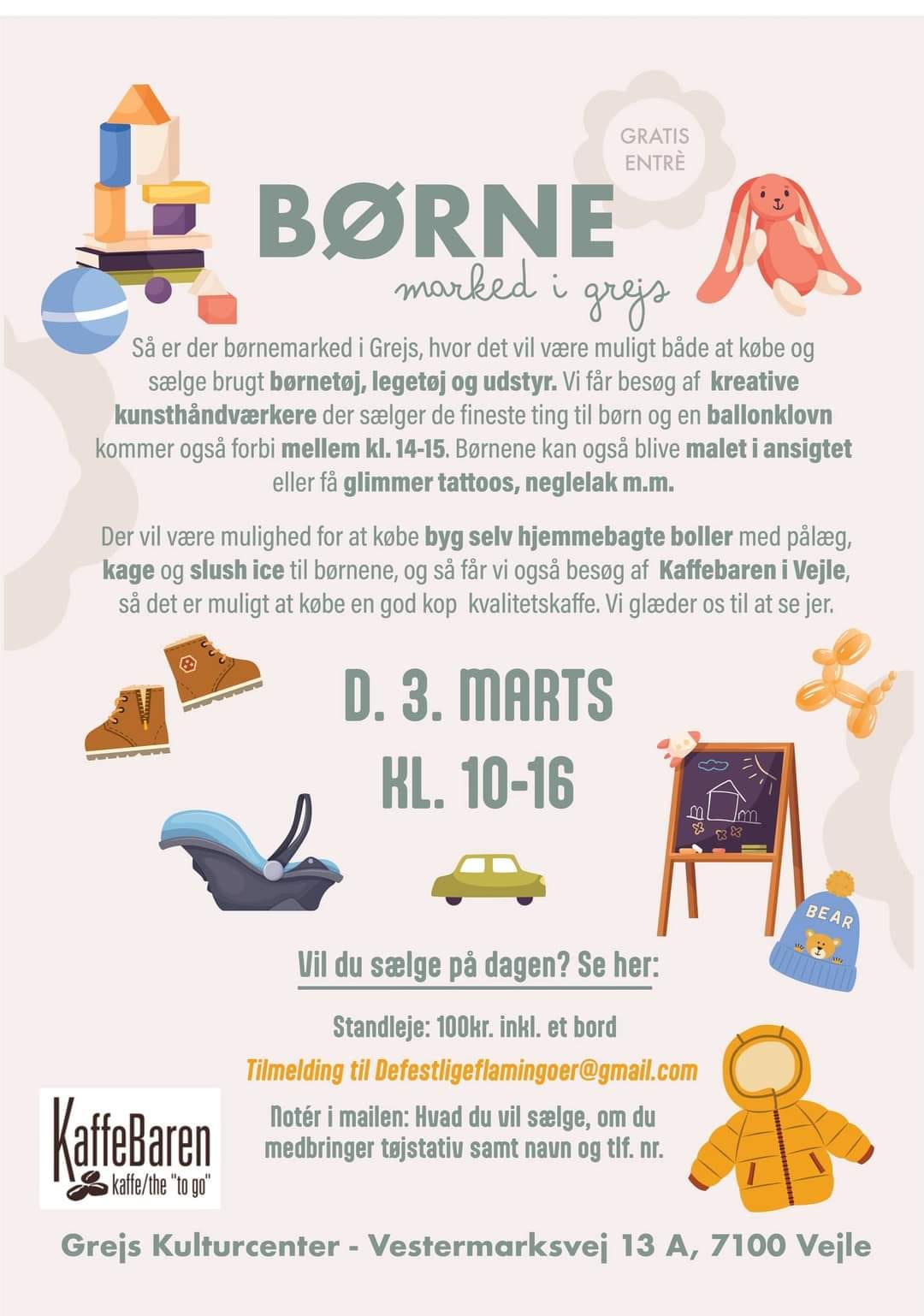 SUMMARY:Børnemarked i Grejs Kulturcenter Søndag den 3. Marts Kl. 10 - 16.